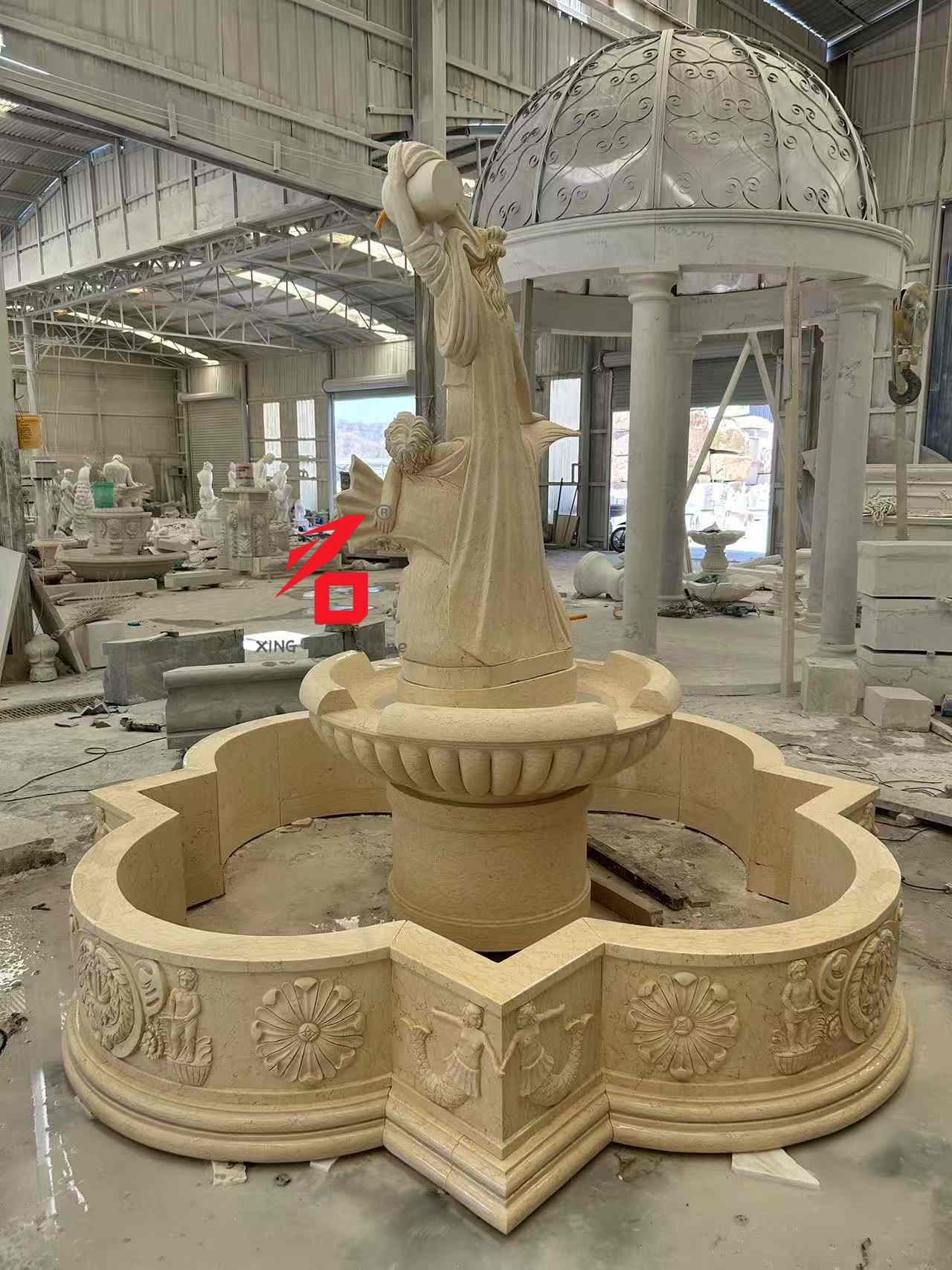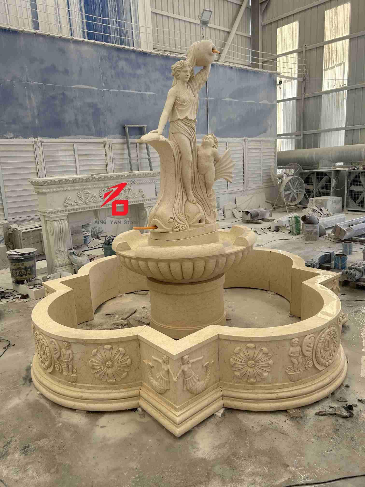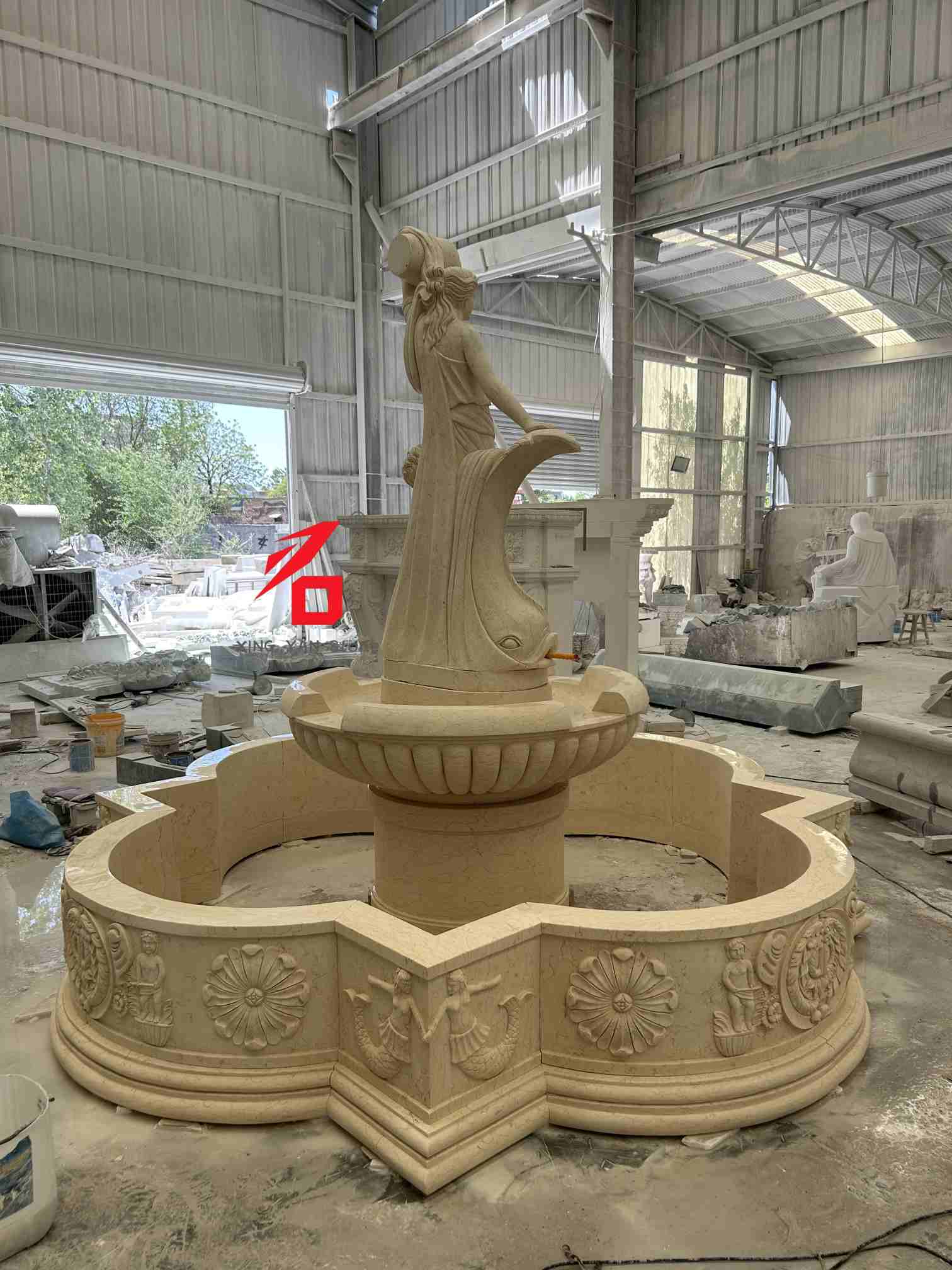 Варіанти каменю: спеціальні варіанти каменю включають бежевий мармур, білий мармур, пісковик та інші природні камені. Тонка текстура каменю, теплий колір і сильна стійкість до атмосферних впливів забезпечують довговічність і естетичну привабливість фонтану для тривалого використання на вулиці. Майстерне різьблення: використовуючи традиційні техніки ручного різьблення, досвідчені скульптори ретельно створюють кожну деталь, від виразу обличчя богині та драпіровок до орнаментів у формі дитини та риби, демонструючи художню текстуру та тривимірність європейської класичної скульптури.