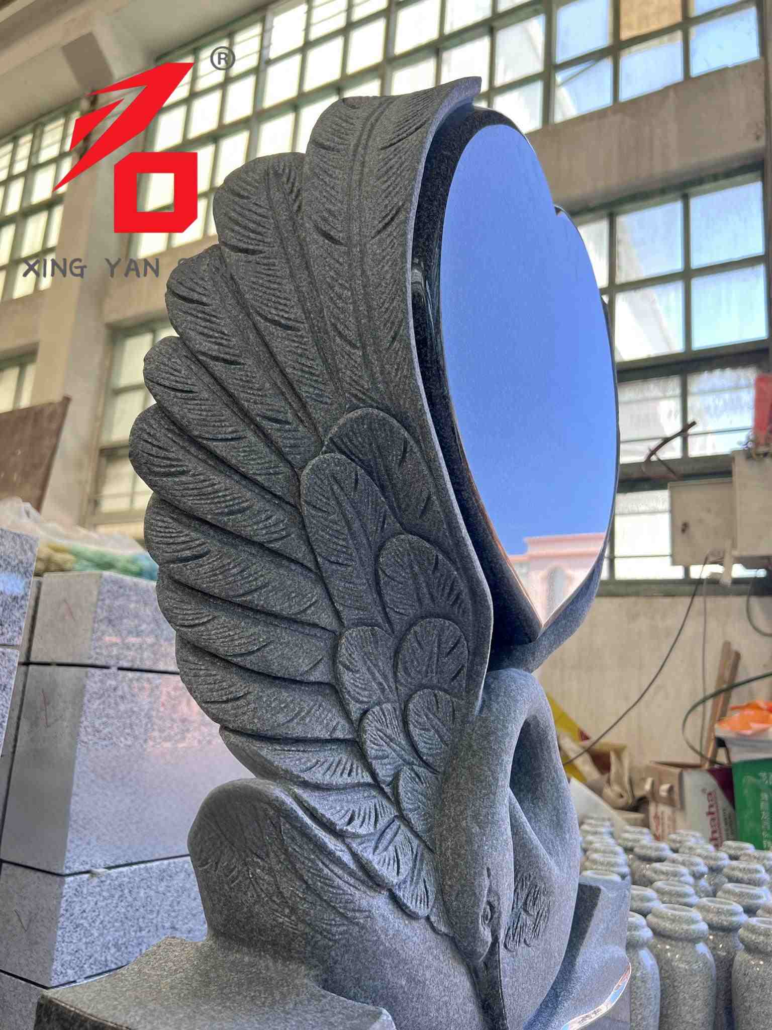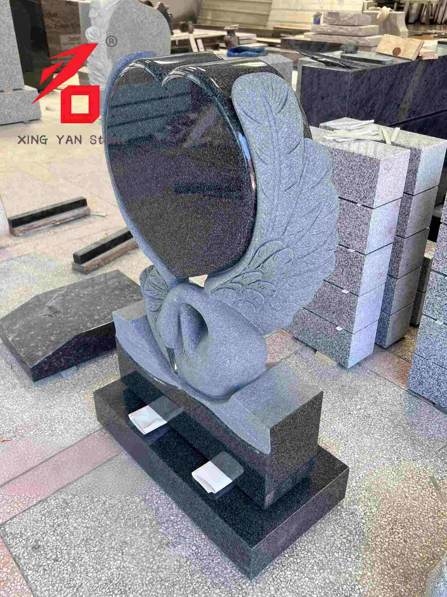 Дизайн: основна частина — це поліроване чорне серце, позаду якого вирізані реалістичні лебедині крила. Форма лебедя і серце символізують вічну любов і пам'ять про померлого. Загальний дизайн має високу художню майстерність, що відрізняє його від монотонного стилю традиційних надгробків.