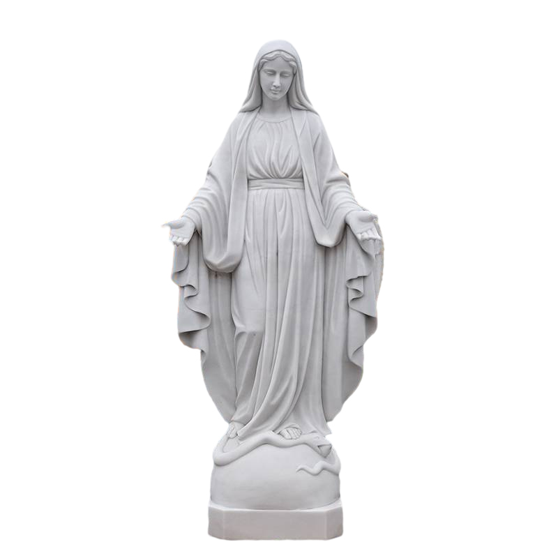 Статуя Діви Марії в мармуровому саду - це вишукана та змістовна мармурова скульптура. Ця скульптура відображає благодать і божественну красу Діви Марії, додаючи відчуття величі та спокою вашому саду чи відкритому простору. Статуя Діви Марії в мармуровому саду демонструє витонченість і скромну красу Діви Марії завдяки її вишуканій майстерності та тонким різьбленням. Скульптура показує Діву Марію, що стоїть серед розпустилися пелюсток квітки, ніжно тримаючи на руках немовля Ісуса, висловлюючи материнську любов і захист. Її обличчя сповнене любові та турботи, змушуючи людей відчувати її турботу та благословення для світу. Мармурова садова статуя Діви Марії підходить для розміщення в садах, дворах або відкритих клумбах.